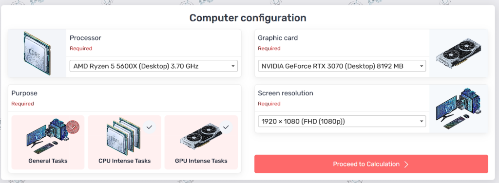 Ensure you tell it your gaming or Graphic Intensive usage so it understands and gives you the correct result. Also tell it the resolution your using as I motioned above as this will change the result considerably.