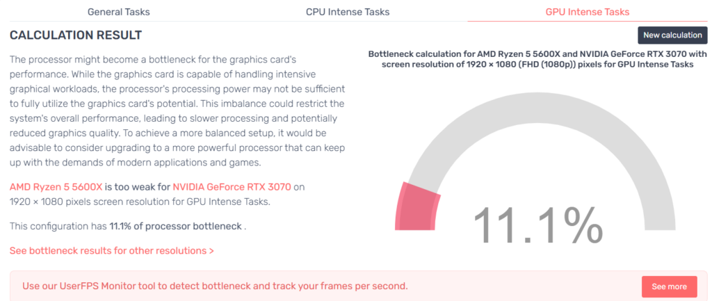AMD Ryzen 5 5600X is too weak for NVIDIA GeForce RTX 3070 on 1920 × 1080 pixels screen resolution for GPU Intense Tasks. This configuration has 11.1% of processor bottleneck .