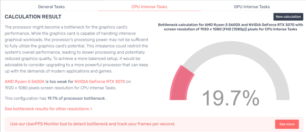 AMD Ryzen 5 5600X is too weak for NVIDIA GeForce RTX 3070 on 1920 × 1080 pixels screen resolution for CPU Intense Tasks. This configuration has 19.7% of processor bottleneck .