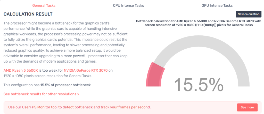 AMD Ryzen 5 5600X is too weak for NVIDIA GeForce RTX 3070 on 1920 × 1080 pixels screen resolution for General Tasks. This configuration has 15.5% of processor bottleneck .